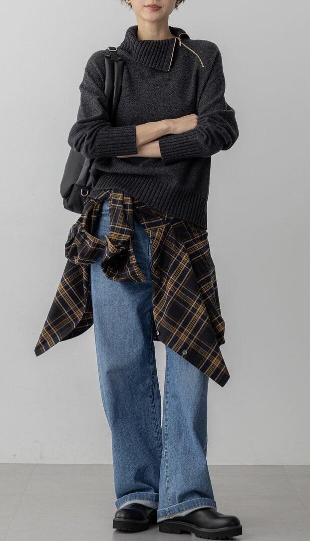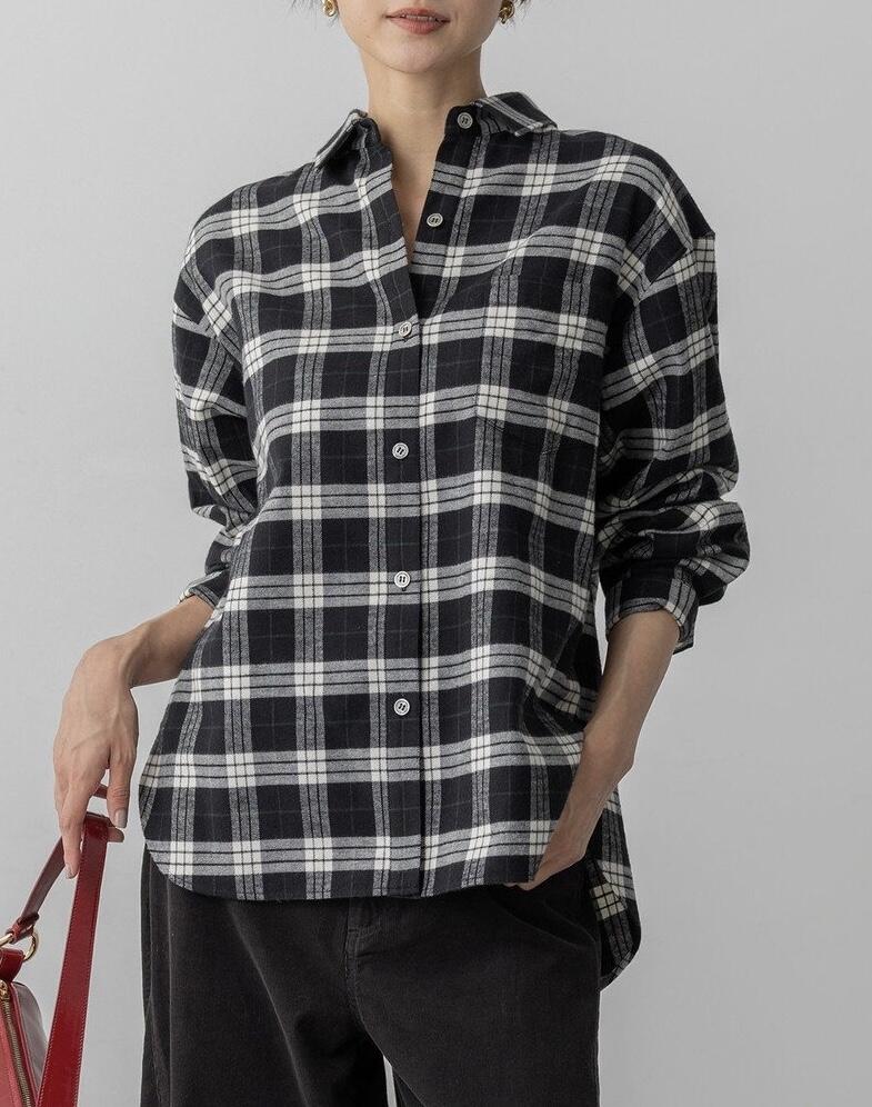 1枚でサマになる、大人の女性のためのチェックシャツ。襟元は自然と抜け感を演出するデザインで、カジュアルなチェック柄ながらも上品な印象。