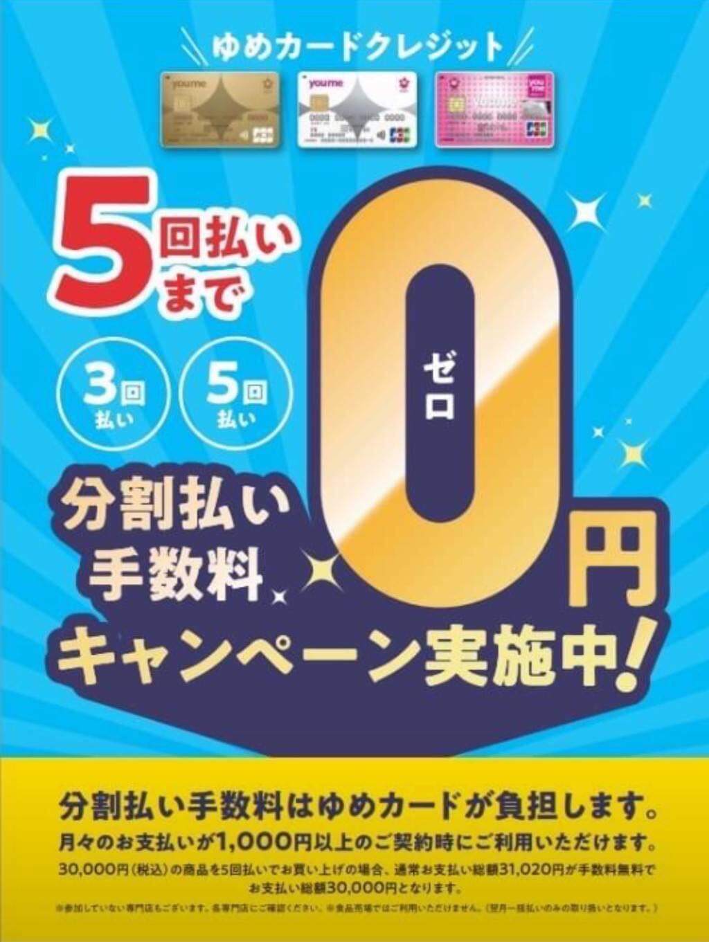 ゆめクレジット5回払いまで手数料0円キャンペーンも実施中。
