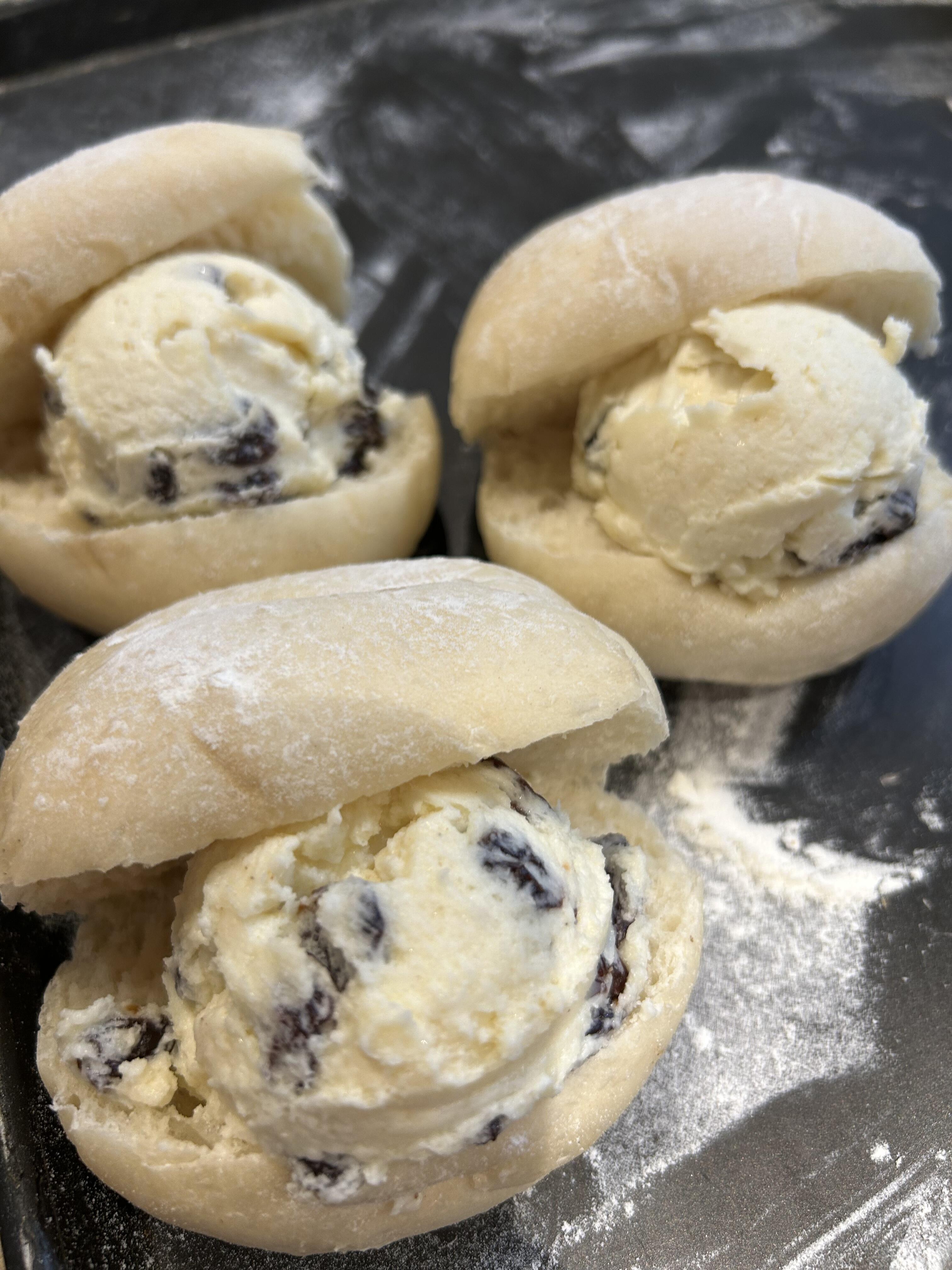 もちもちの生地にラムレーズンクリームをたっぷりサンド!甘党の方ぜひご賞味ください!