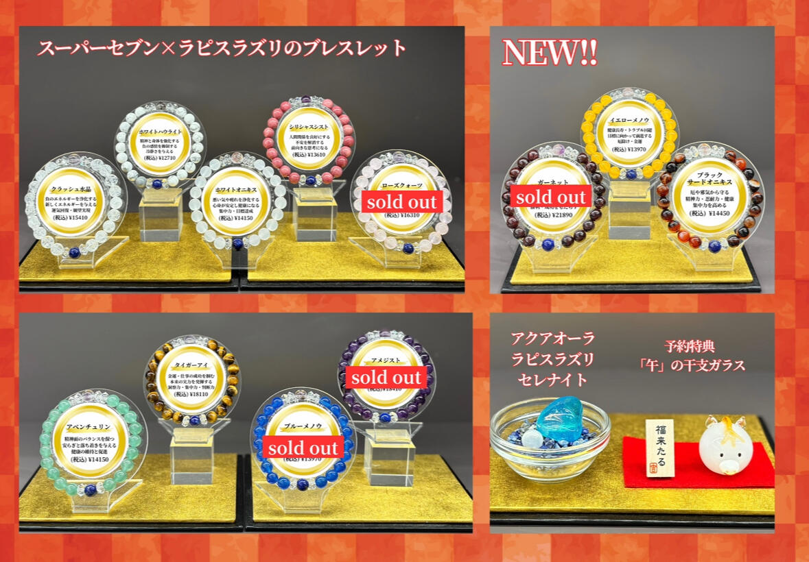 周りの選べるパワーストーンは今回初登場のイエローメノウ・ブラックサードオニキスや去年即完売のシリシャスシストなどをご用意してます。