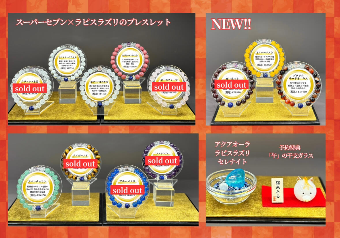 周りの選べるパワーストーンは今回初登場のイエローメノウ・ブラックサードオニキスや去年即完売のシリシャスシストなどをご用意してます。