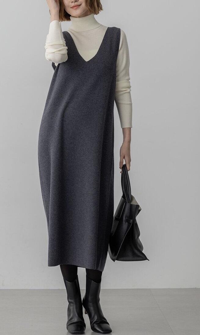 ワンピースは、やや広めのVネックなのでカットソーやタートルネックをインに合わせても着回しを楽しめるデザイン。
