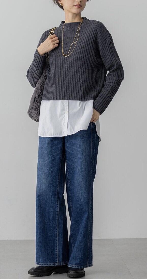 ワイドリブで編み上げた短丈プルオーバーと総針編みVネックのジャンスカ風ワンピースがセットになったアイテム。