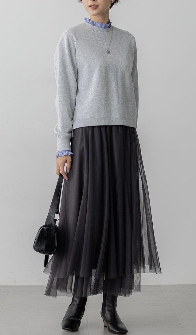 チュールを重ねることで、奥行きのある表情と軽やかな動きを演出するスカート。カジュアルなスウェットやニットと合わせてデイリーにはもちろん、きれいめのジャケットと合わせて、オケージョンシーンにも着用いただけます。