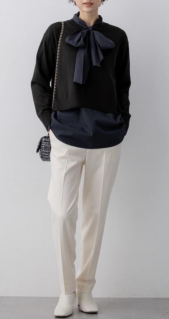 ニットはベーシックなクルーネックプルオーバーで、短め丈なので重ね着も楽しめます。