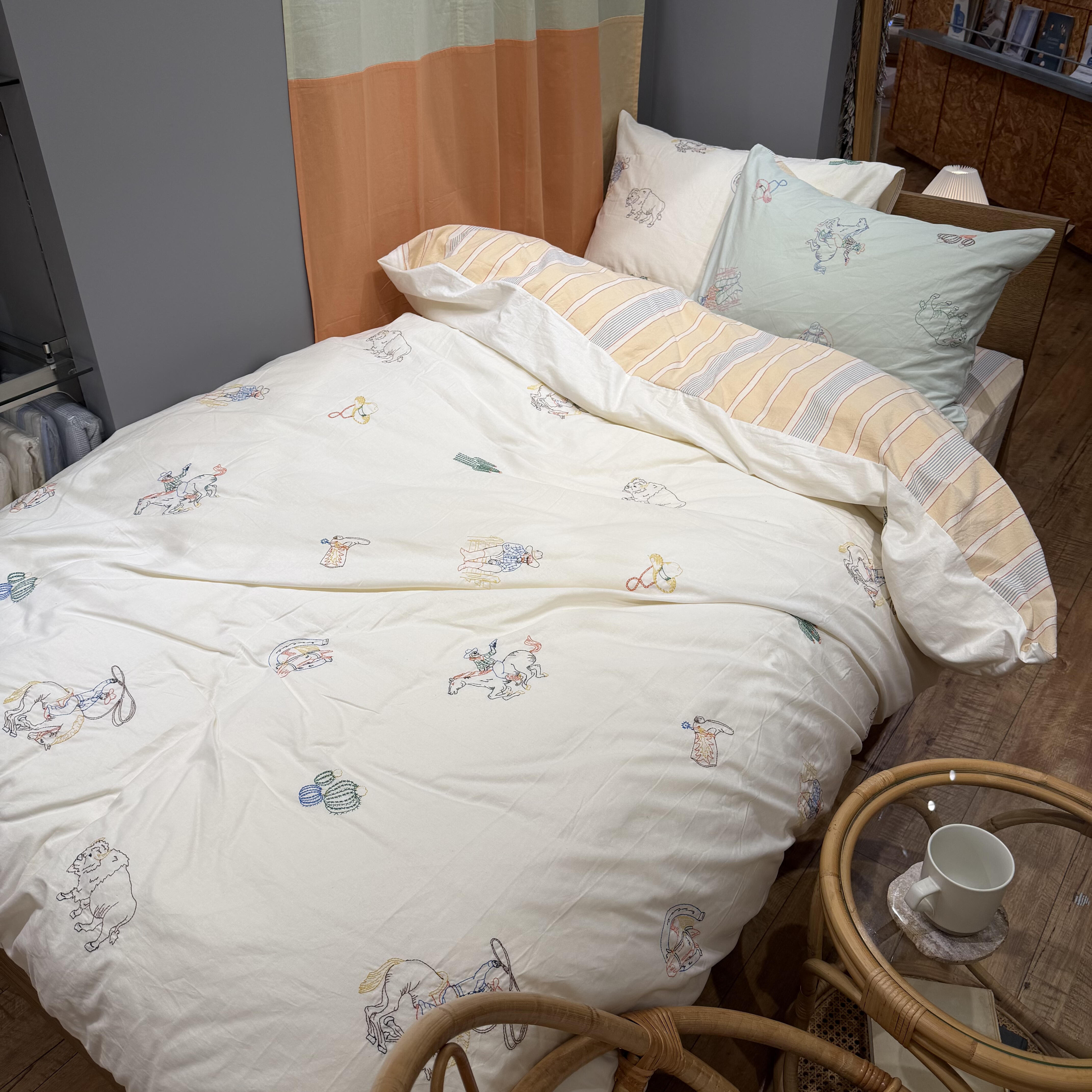 カウボーイにまつわる柄の刺繍をちりばめた、ヴィンテージテイストのベッドリネンです。
