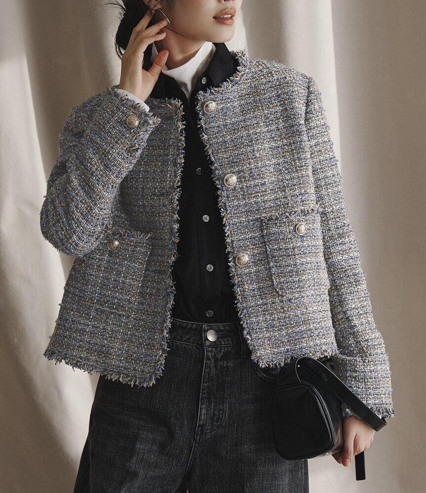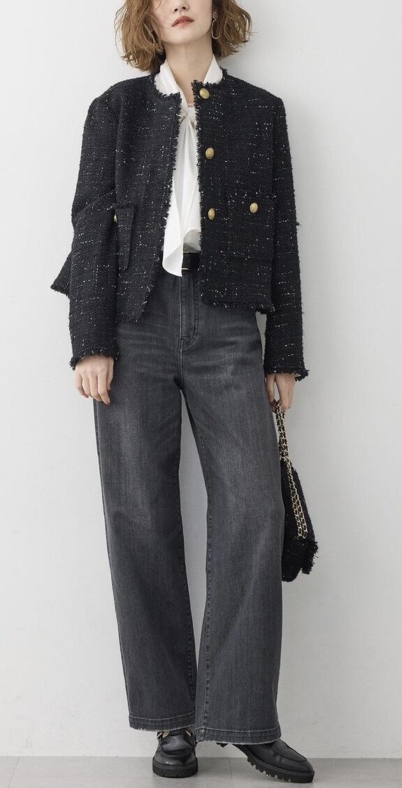 コンパクトな着丈とボクシーなシルエットできちんと感を持たせつつ、フリンジやゴールドをきかせたメタル釦がアクセントになります。