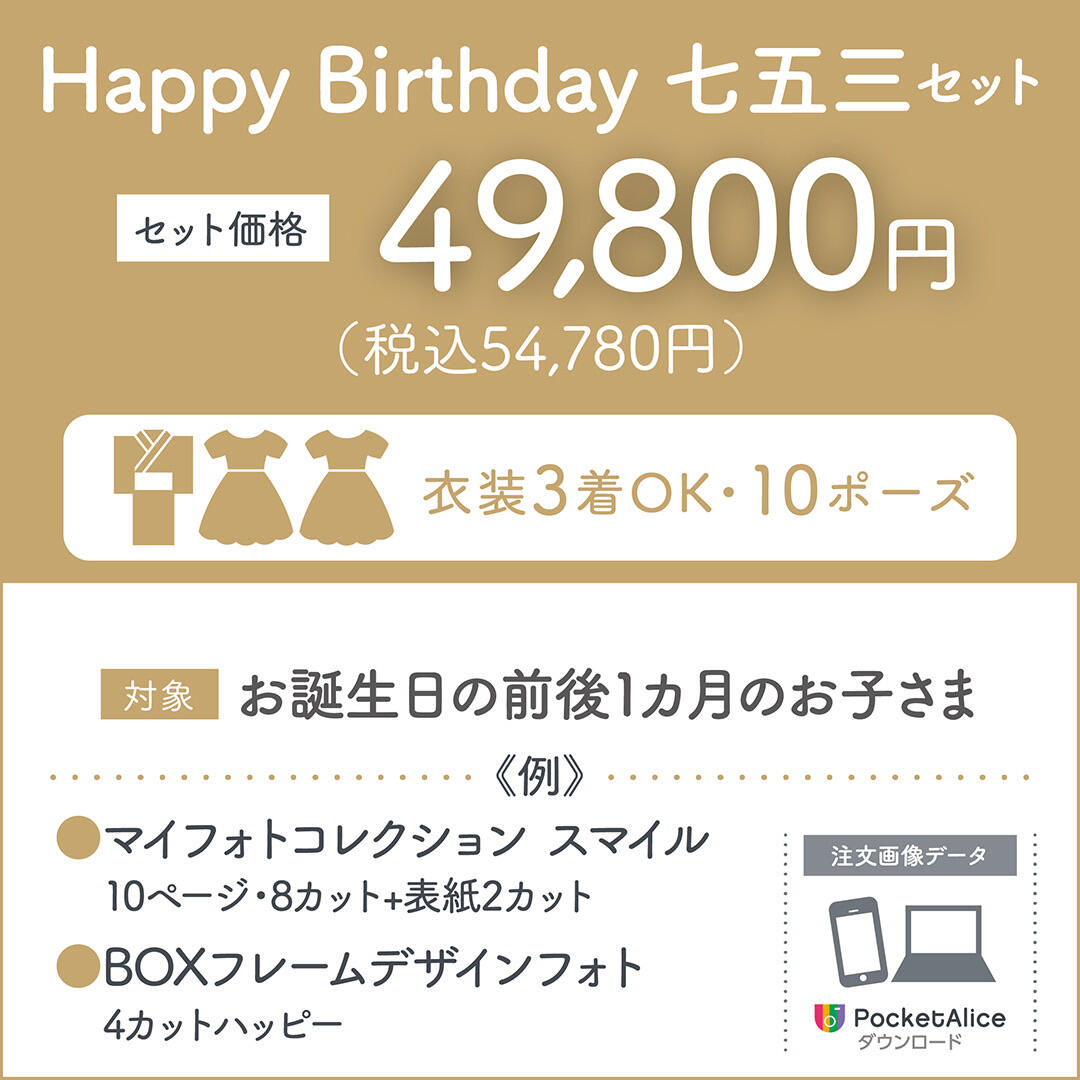 1歳お誕生日撮影で、"ご持参いただいた"お誕生日プレゼントと一緒に撮影(ご購入)いただいた方にもれなく「1st birthday book(お写真1枚付き)」と「sns用データ」をプレゼント!