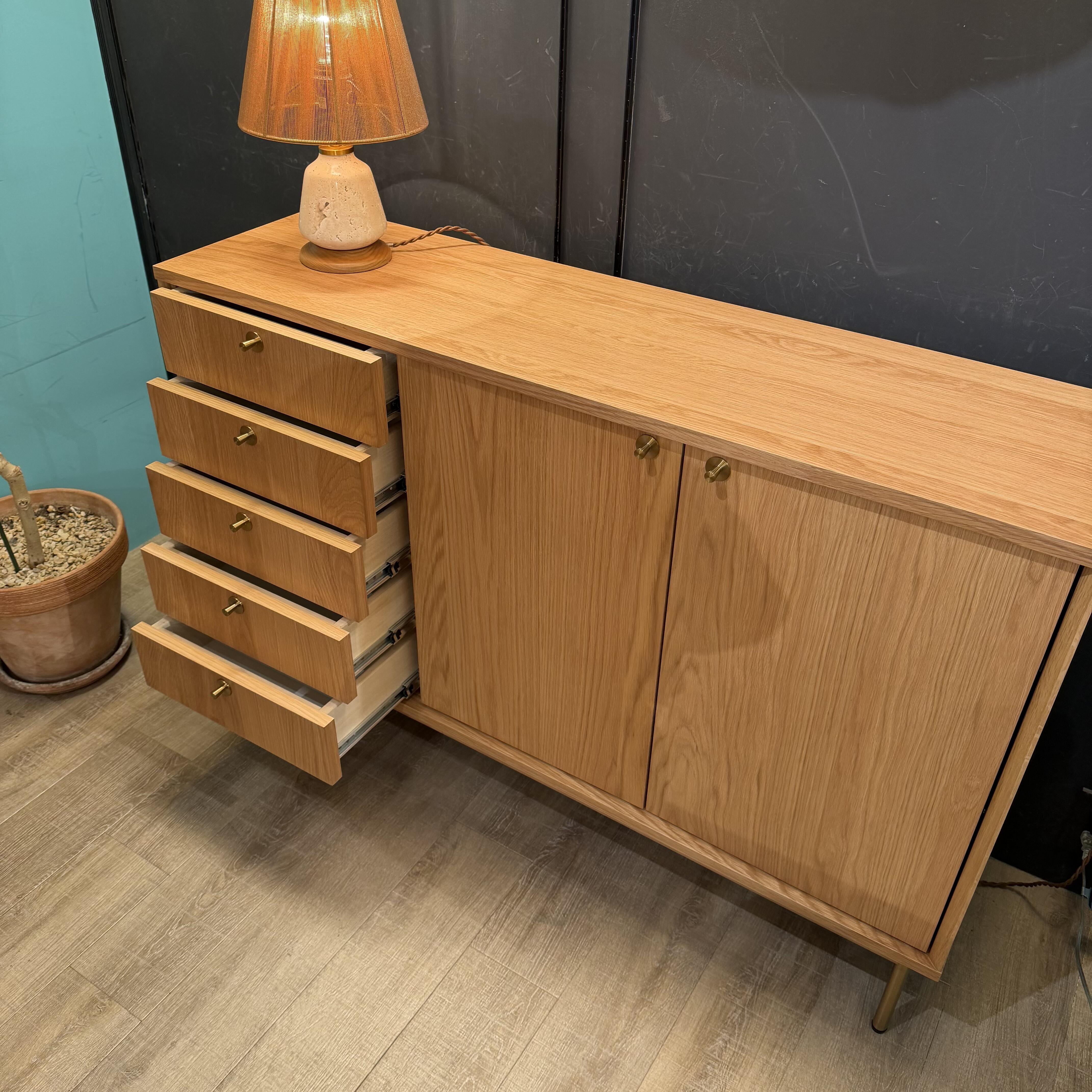 やわらかな印象のオーク材と、真鍮カラーの取っ手が印象的なPUHUAシリーズのキャビネットをご紹介いたします!