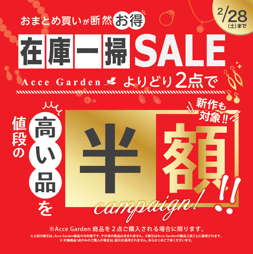 アクセサリーコーナーの品よりどり2点お買い求めいただけますと、値段の高い品を税込価格より半額にします!
