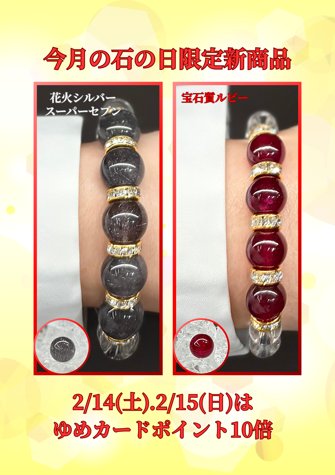 毎月14日・15日の石の日はゆめカードポイント10倍と限定の新商品が入荷します。