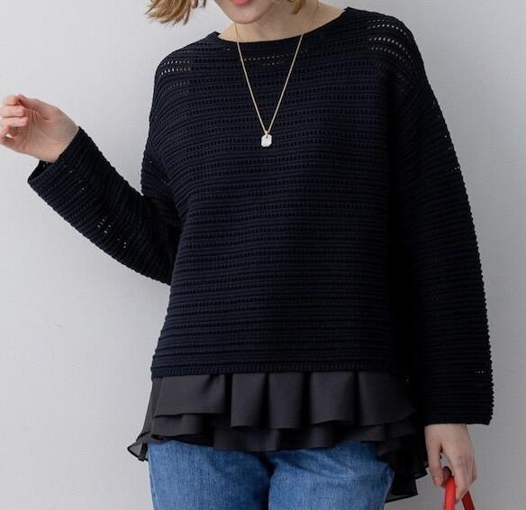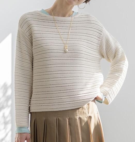軽やかアイレットとツヤ感で魅せる、きれいめボートネックニット