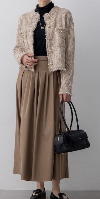 ゆったりとしたニットから、きちんと感のあるジャケットまで、様々なトップスと相性が良く、オンオフ問わず幅広いシーンで活躍する万能アイテムです。