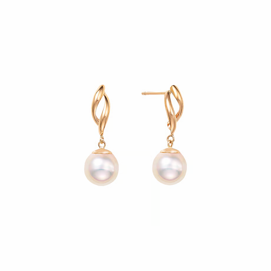 イエローゴールドの艶が映えるスッキリとしたフォルムの地金の下でアコヤパールが上品に揺れるピアス。