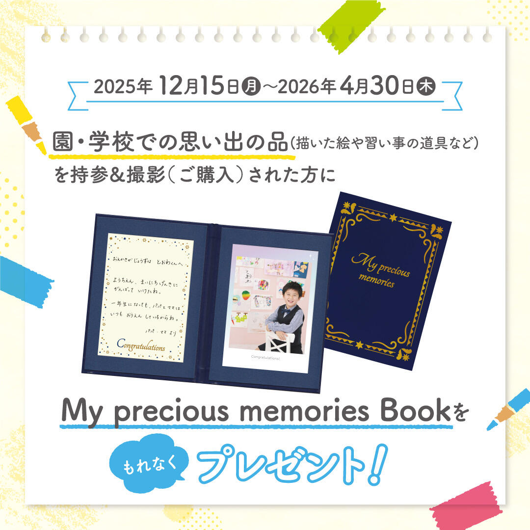 思い出の品を持参して一緒に卒園・卒業の撮影(ご購入)された方に、お写真が1枚入った"My precious memories book"をプレゼント◎