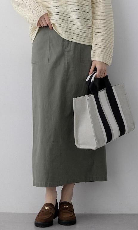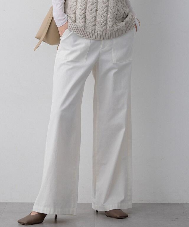 フロントのステッチ入りポケットがアクセントになり、トップスをインしたスタイルもメリハリよく決まります。