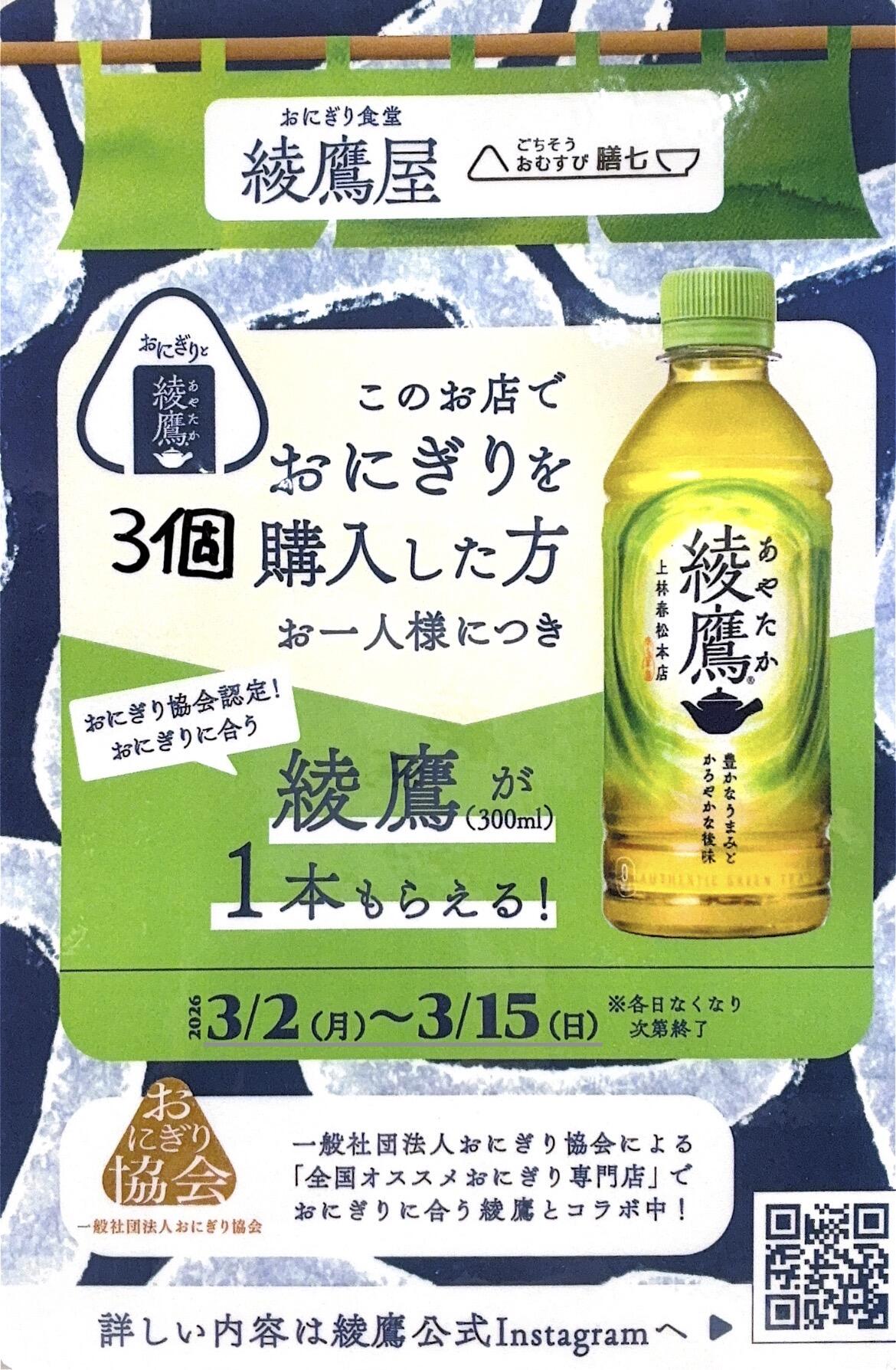 3月2日から当店のおむすび3個購入した方に綾鷹1本プレゼントいたします。