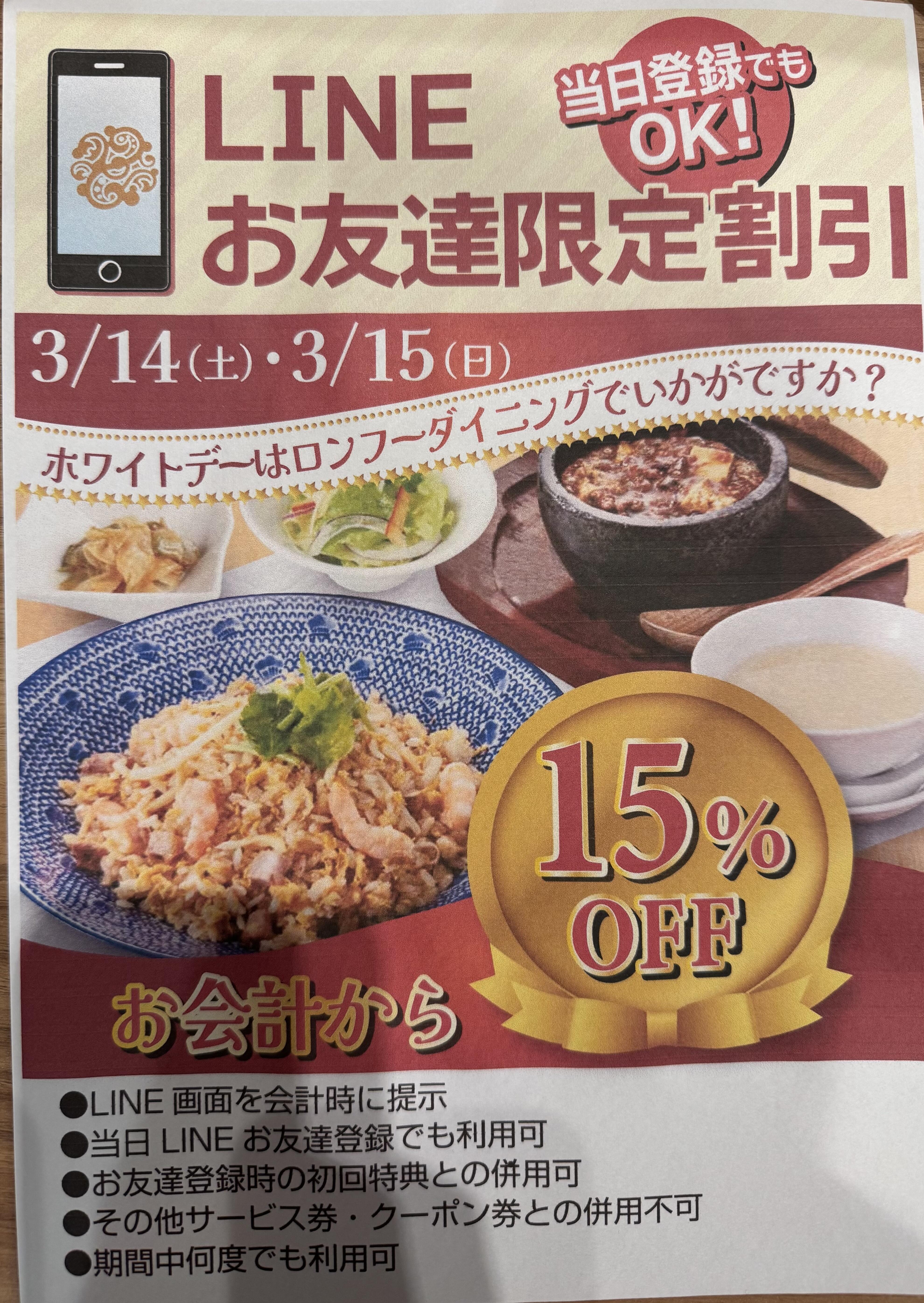 いつもロンフーダイニングレクト広島ご利用頂き誠に有難う御座います。 3月14と15日LINEお友達登録で15%割引させていただきます。