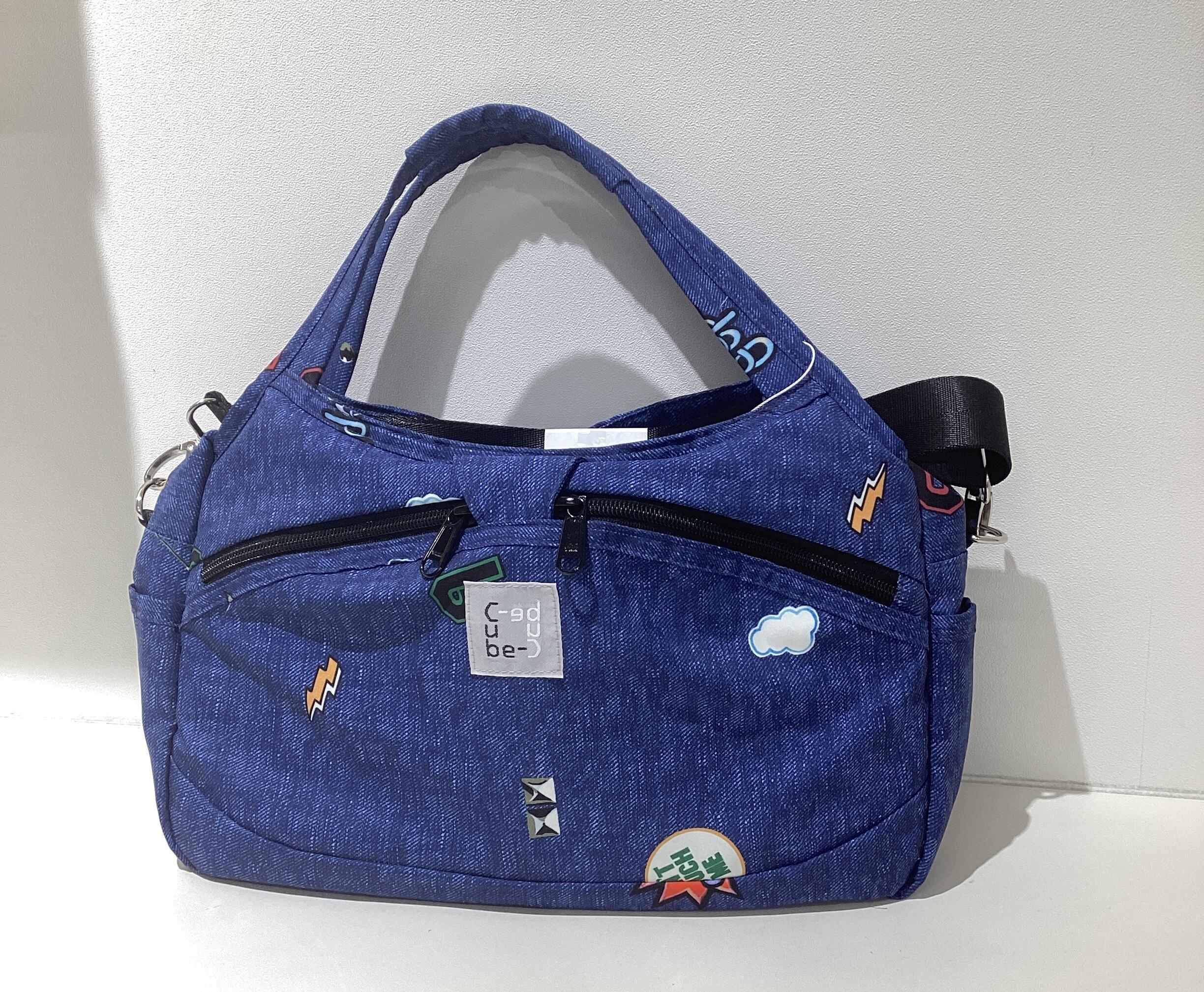 デニム生地とワッペンのモチーフをあしらった