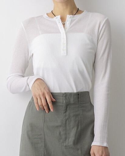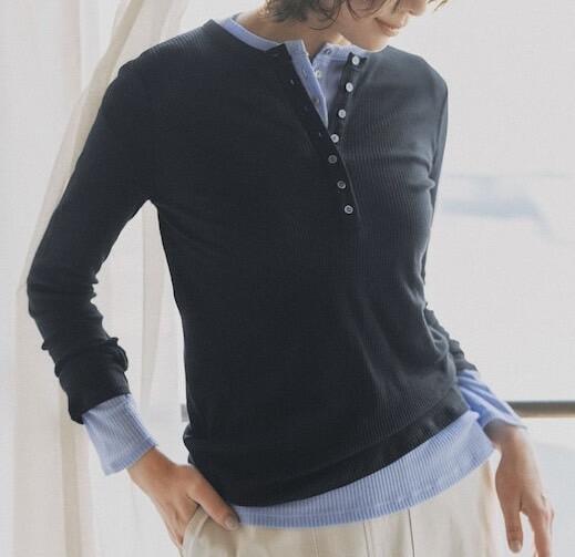 旬の透け感とレイヤードを楽しむ、大人のヘンリーネックトップス